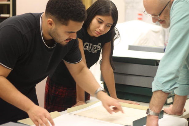 Caua Almeida, Layslla Pereira, Donald Curtis handle documents in the Stowe Center's archival vault