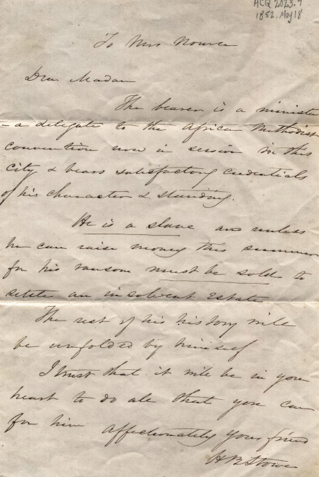 In 1852, Harriet Beecher Stowe wrote to friends urging them to support the Reverend Thomas Strother, an enslaved man under threat of being sold by creditors to cover the debts of his enslaver, then deceased.