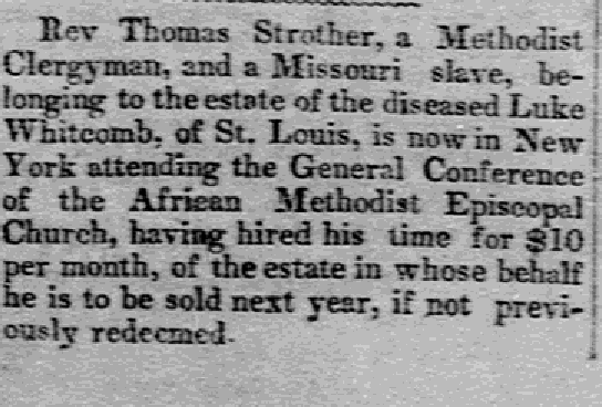 Reverend Strother was enslaved by a St. Louis merchant who died in 1850 deeply in debt. His estate was taken by creditors who were selling it off. Reverend Strother, his wife, and his daughter were part of this estate. Throughout 1851 and ‘52, Reverend Strother travelled the country trying to raise $1,600, an incredible amount of money at the time, to purchase the freedom of his wife, daughter, and himself. Additionally, Reverend Strother had to pay the creditors, now the de facto enslavers, $10 a month in order to be able to leave to raise the funds. His wife and daughter remained in St. Louis.