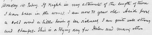 If right in my estimate of the length of time I have been in the world, I am now 70 years old. Aside from a cold and a little hint of sea sickness, I am quite well strong and cheerful.