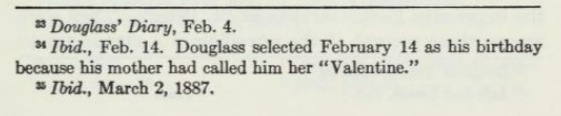 It is then the 20th-century Black historian, Dr. Benjamin Quarles, who provides a source for the Valentine nickname story. In his landmark 1948 biography of Douglass, Quarles has a brief explanatory footnote about the February 14th diary entry. Quarles simply says, “Douglass selected February 14 as his birthday because his mother had called him her ‘Valentine’” (Quarles 311).