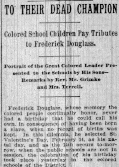 Frederick Douglass, whose memory the colored people continually honor, never had a birthday that he could call his own. In consequence of having been born a slave, when no record of births was kept. In this dilemma, he selected St. Valentine’s Day, February 14, as his natal day. (The Washington Post, February 13, 1897, page 9)