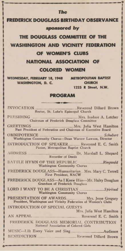 1948 Program for a Frederick Douglass Birthday observance where both Terrell and Haley Douglass are listed as speakers. Courtesy Anacostia Community Museum Archives.